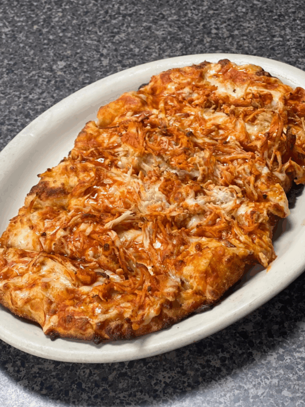 Buffalo Flat Bread – Flatbread topped with buffalo sauce, chicken, and mozzarella, baked spicy and fresh at Leonore’s Restaurant Virginia.