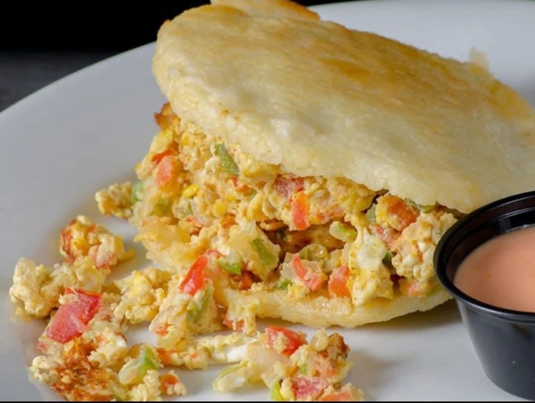 Reina Pepiada – Venezuelan arepa filled with shredded chicken salad, avocado, and mayo, a creamy classic at Leonore’s Restaurant Virginia.