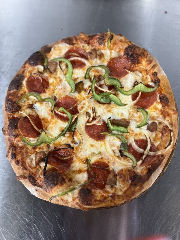 Supreme – A bold mix of sun-dried tomato, mozzarella, pepperoni, sausage, onion, and green pepper, baked fresh at Leonore’s Restaurant Virginia.